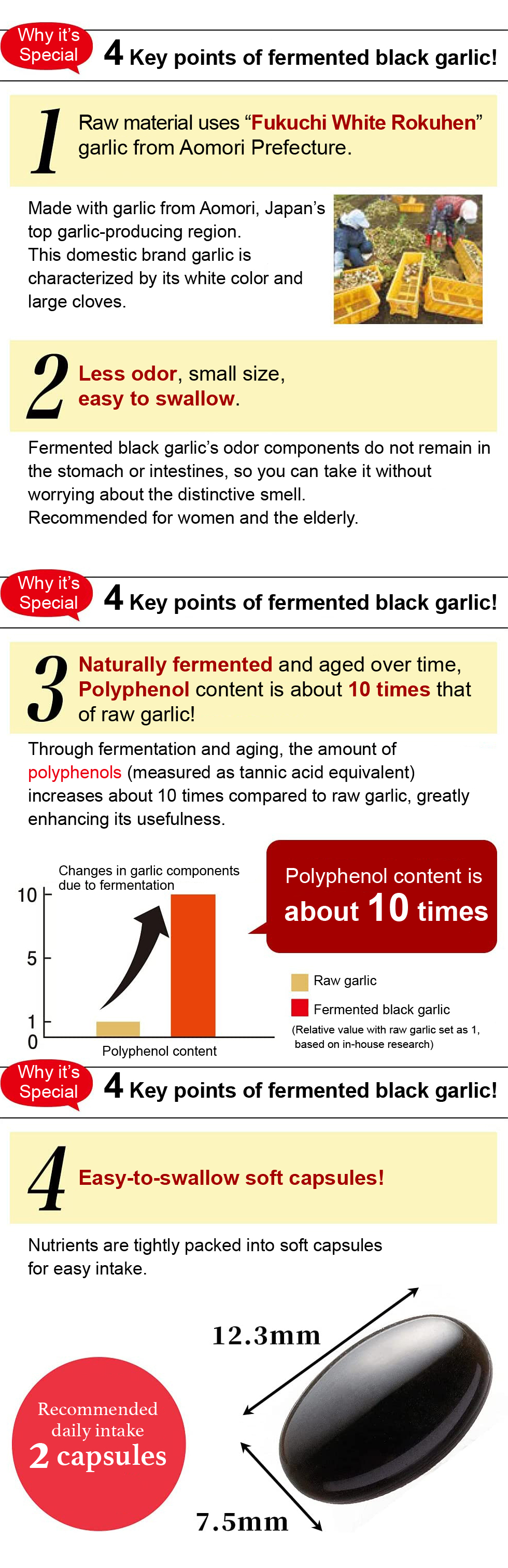 Fermented black garlic powder, safflower oil, gelatin, glycerin, vitamin C, glycerin fatty acid ester, beeswax, lecithin (derived from soybeans)