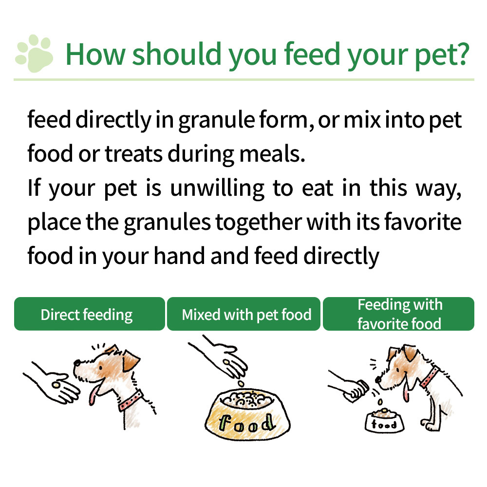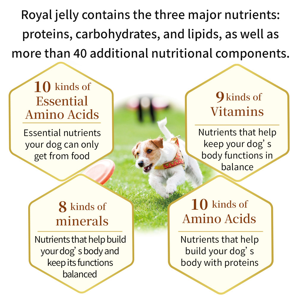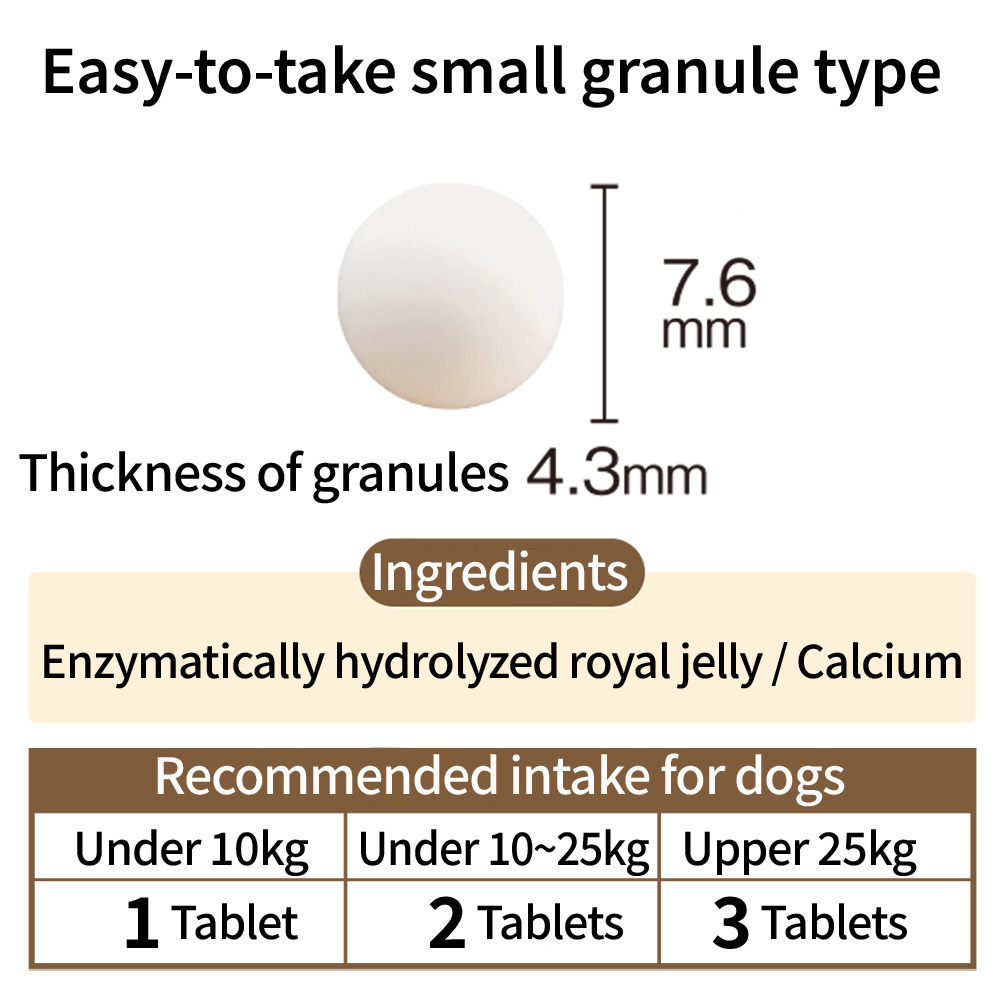 This is a health supplement specially designed for small dogs, made into small granules for easy intake. It contains royal jelly, which is rich in protein, vitamins, and minerals in a well-balanced form.