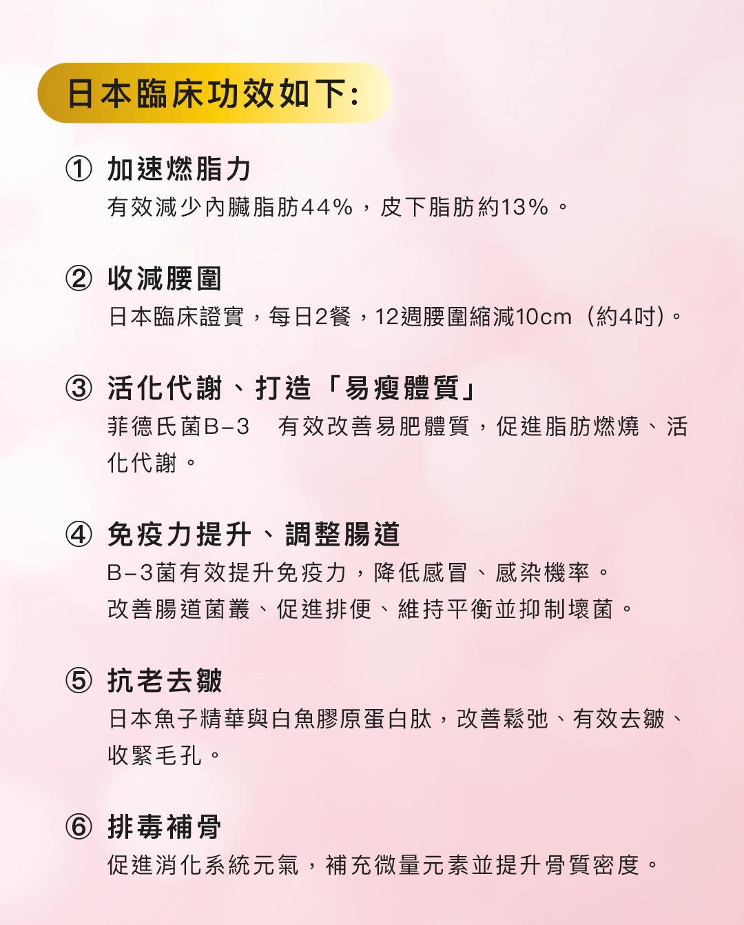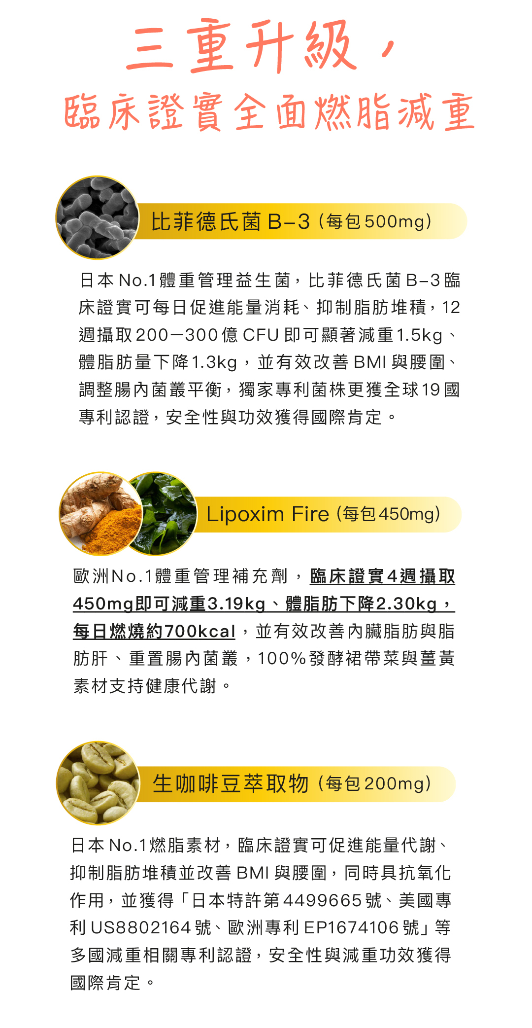 ③ 活化代謝、打造「易瘦體質」: 菲德氏菌B-3 有效改善易肥體質,促進脂肪燃燒、活化代謝。