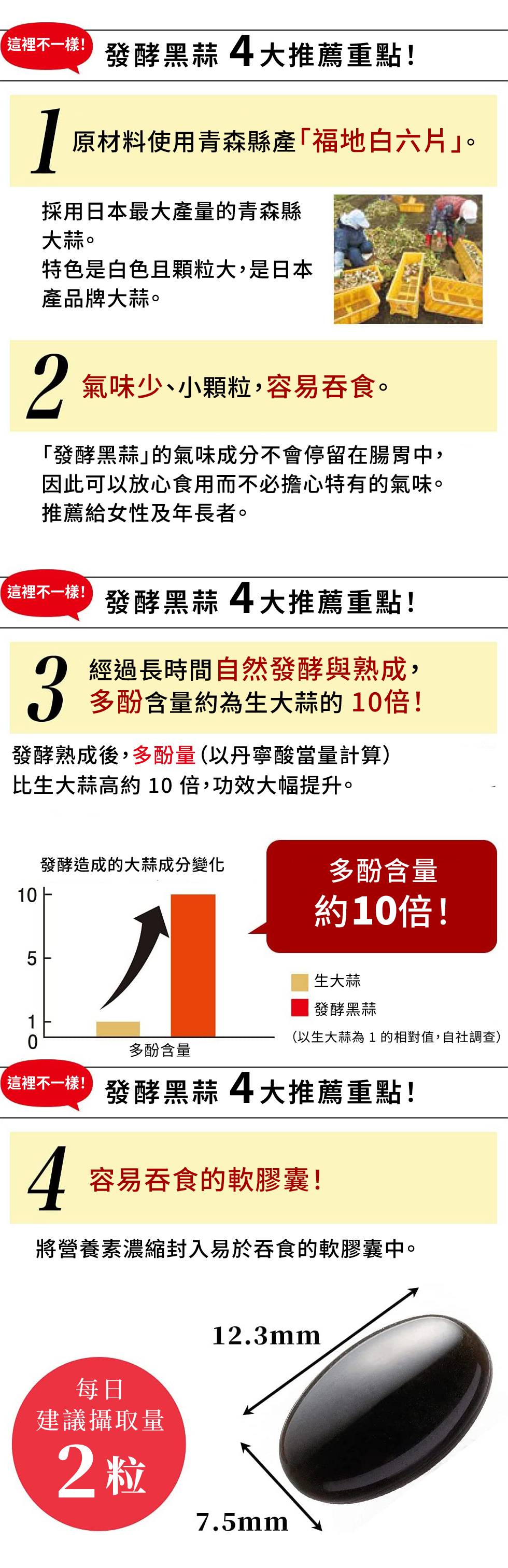 發酵黑蒜粉、紅花油、明膠、甘油、維生素C、甘油脂肪酸酯、蜂蠟、卵磷脂(源自大豆)