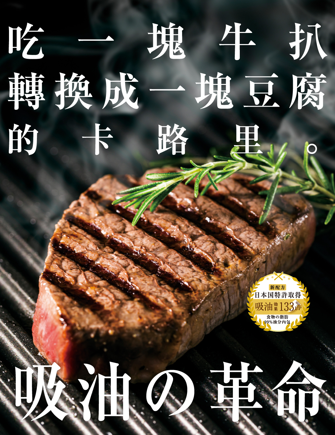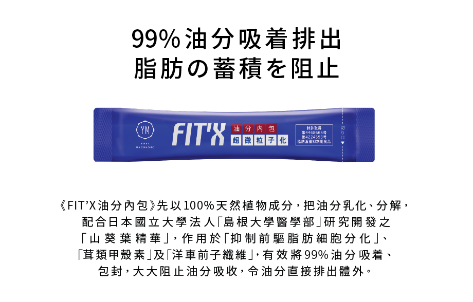 新配方「吸油效果133% UP」!結合日本國立大學醫學部研發的「山葵葉精華」,配合「茸類甲殼素」,其特質不溶於水及胃酸,有效覆蓋腸壁,強效阻隔食物的油分。