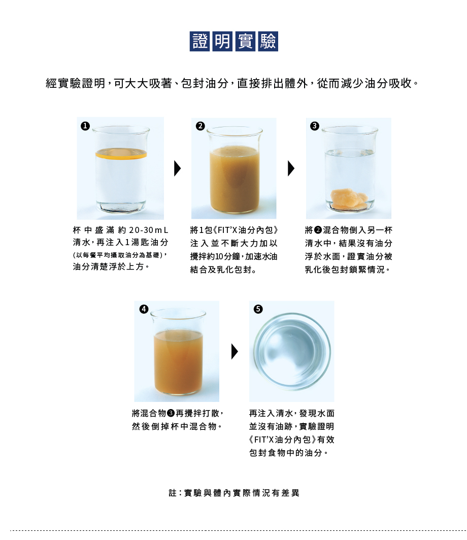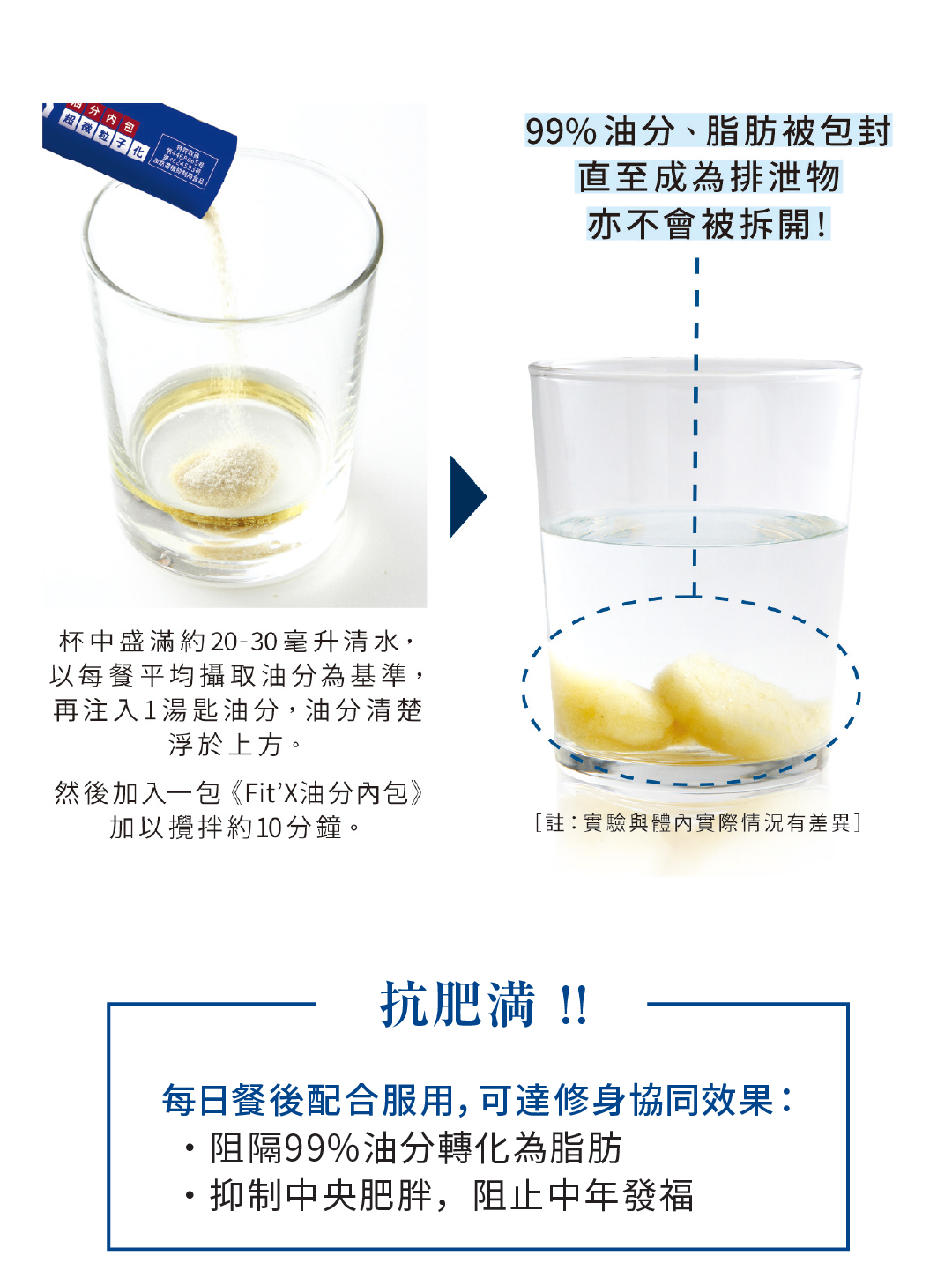 餐後一包,將食物中的油分、脂肪99%乳化、包封,直接排出體外,同時抑制脂肪細胞分裂。