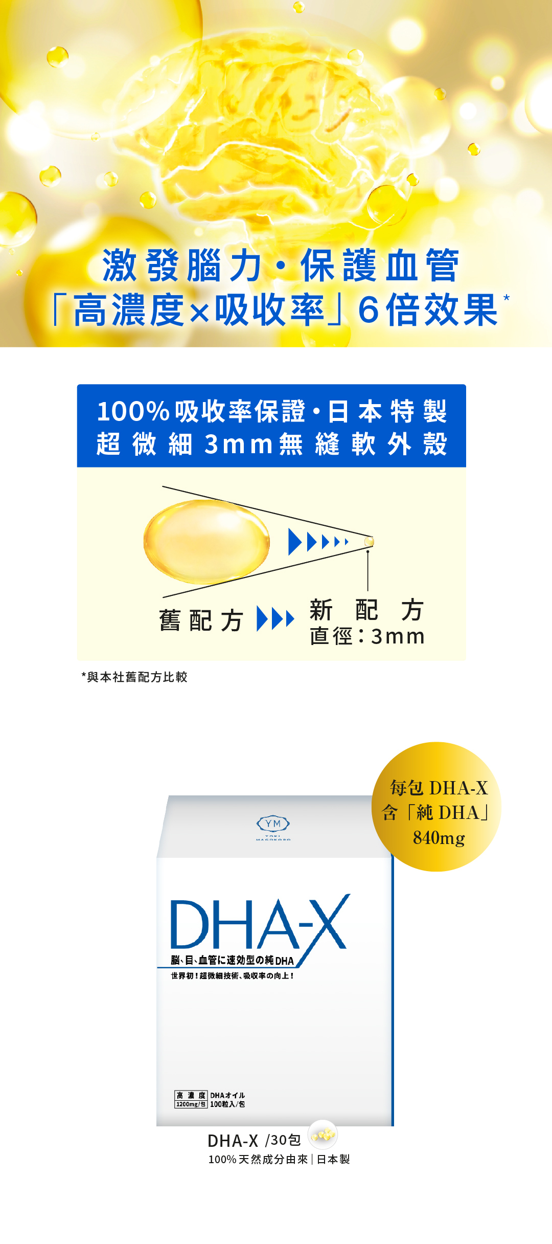 日本No.1科技「高濃度x吸收率」6倍效果*,超微細3mm無縫外殼,令DHA滲透小腸再被100%吸收。