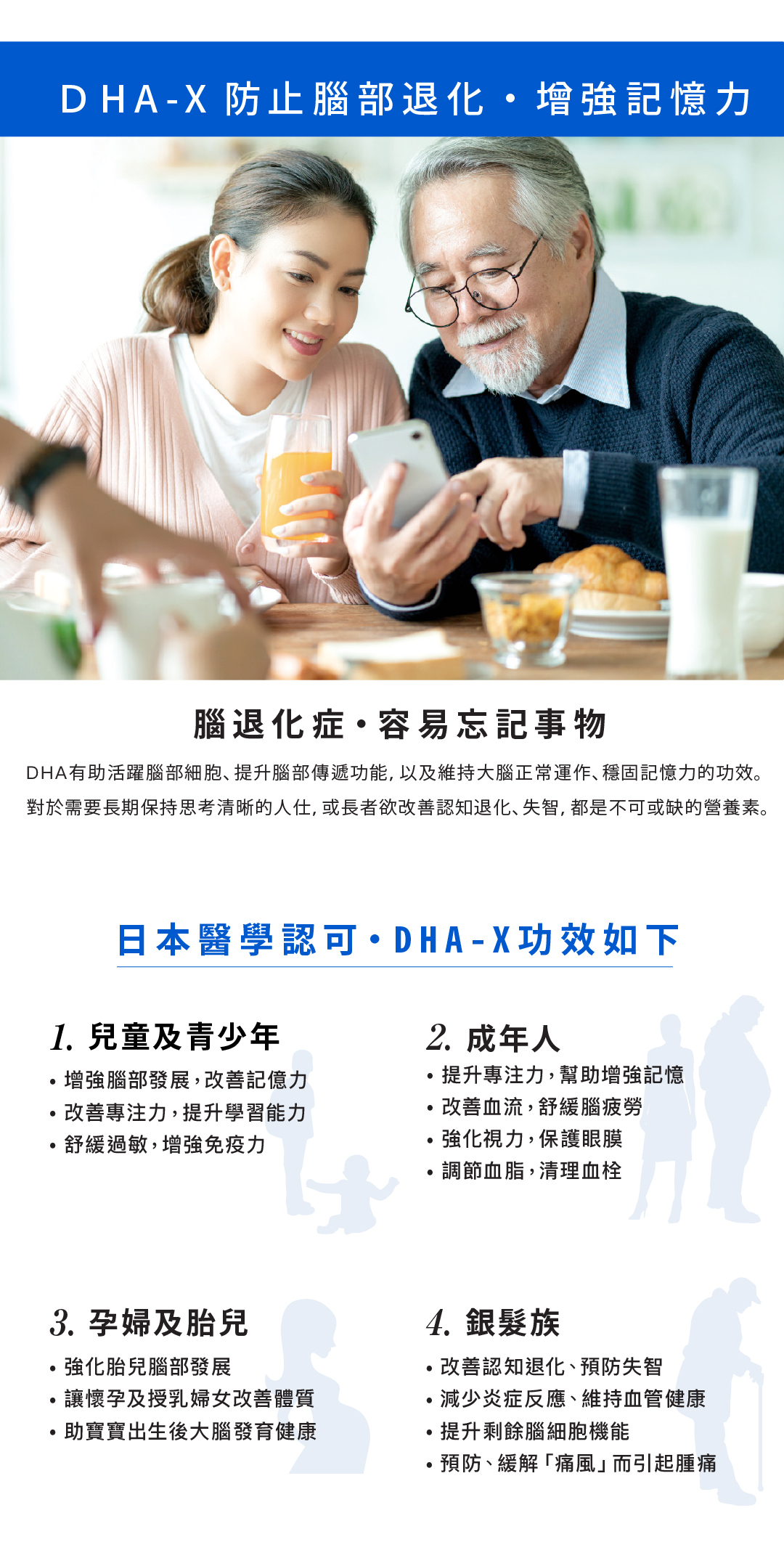 每包DHA-X精製魚油1200mg,內含「純DHA」840mg,適合全家、孕婦及老年人攝取。